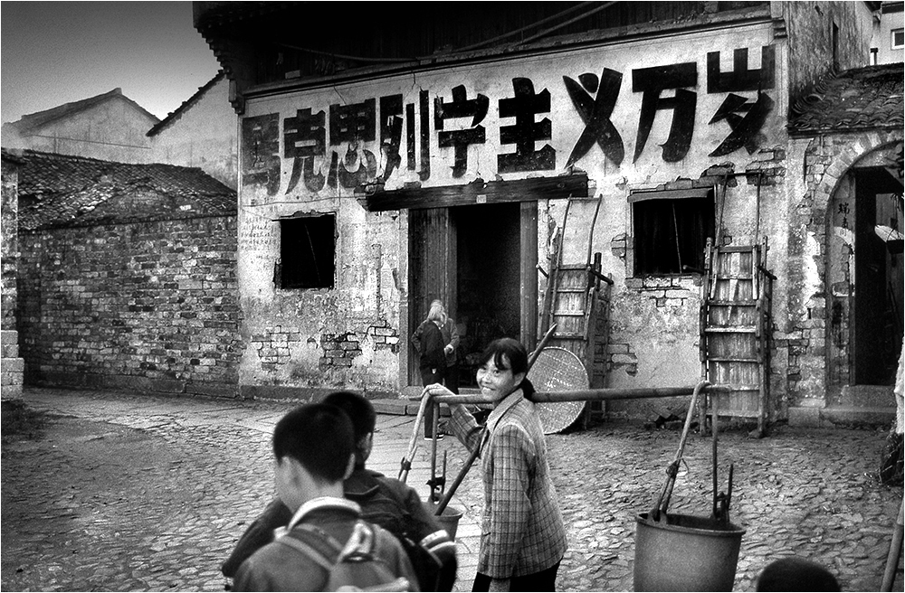Girl in fron of store w political sign 2000