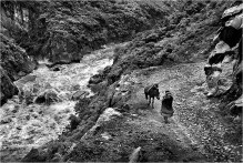 Jinshaw Jiang Woman, child w pony near upper Yangtze river 1987